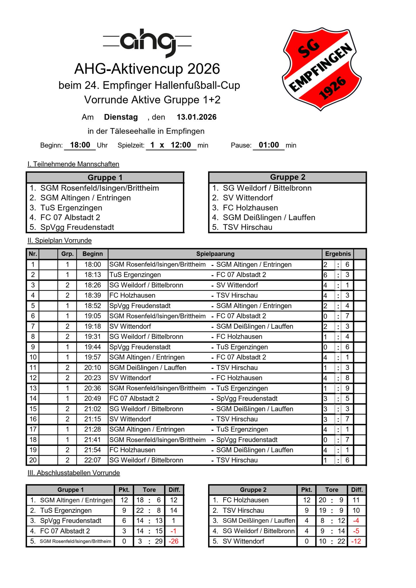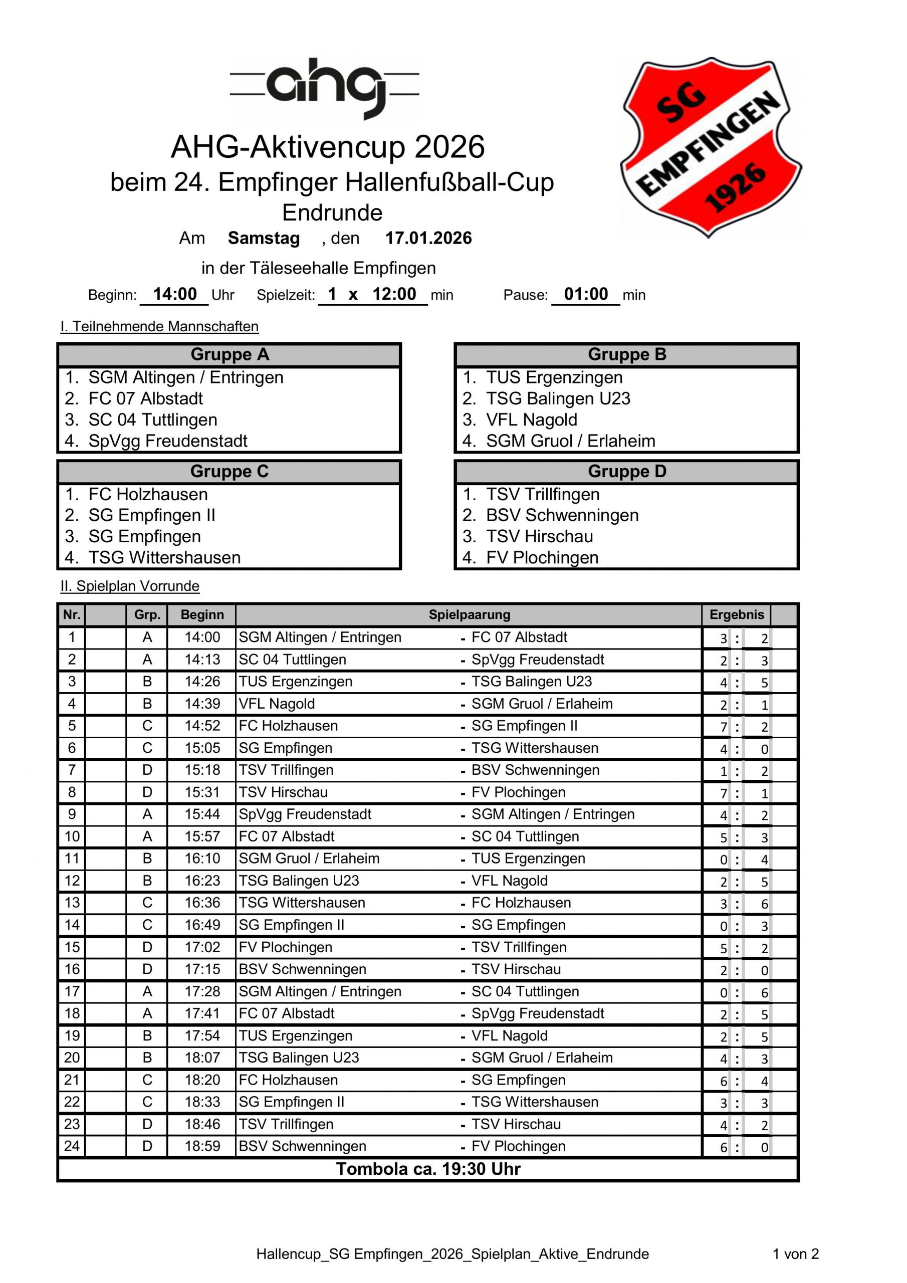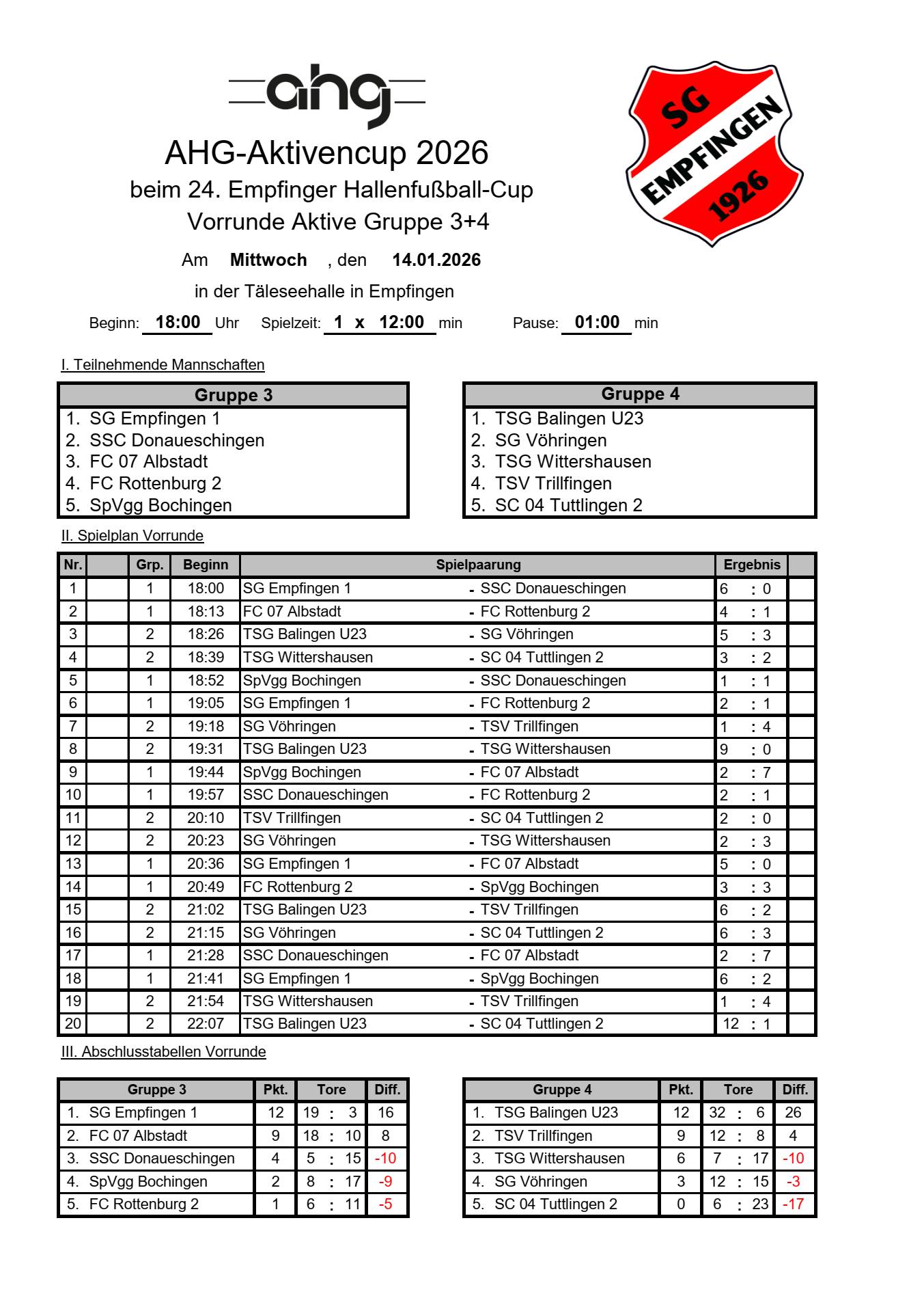 Beim 24. Empfinger Hallen-Cup der SG Empfngen in der Täleseehalle konnte sich der FC 07 Albstadt I (am Mittwoch, 14.01.2026) als Vorrunde-Tabellenzweiter (Gruppe 3) für die Endrunde am Samstag, 17.01.2026 qualifizieren.