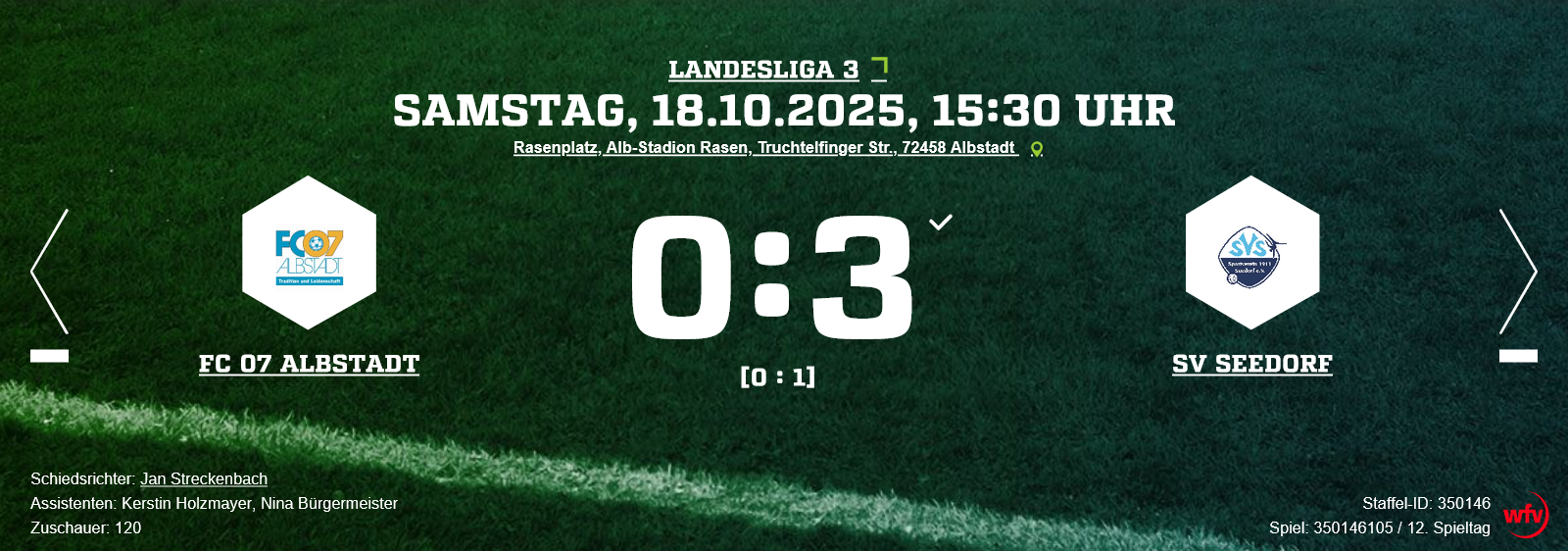 FC 07 Albstadt – SV Seedorf 0:3 (0:1). Diese Niederlage tat weh, traf tief ins Albstädter „Fußball-Herz“: Die engagiert und kämpferisch agierende Akbaba-Elf erspielte sich ihr klares Chancenplus, doch es gelang kein Treffer!, Deutlich effektiver die vielfach bedrängten Gäste, denen es trotzdem gelang diese Landesliga–Partie für sich zu entscheiden: „Nur“ drei Einschussmöglichkeiten über 90 Minuten reichten der Seedorfer Elf – zwei Tore aus Standard-Situationen und ein Konter-Treffer, um am Ende drei Zähler zu verbuchen.