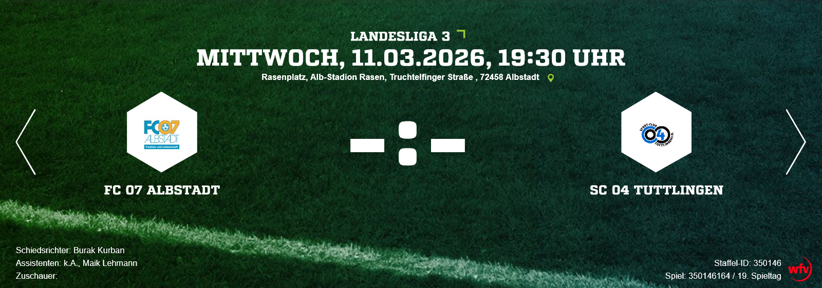 FC 07 Albstadt – SC 04 Tuttlingen (Mittwoch, 11.03.2026, 19:30 Uhr Albstadion, Albstadt-Ebingen). Im zweiten Anlauf klappt es: Anfang Dezember letzten Jahres musste diese Partie witterungsbedingt wegen Unbespielbarkeit des Albstädter Rasens abgesagt werden. Rund drei Monate später steht der Austragung der Begegnung nichts im Weg. Dadurch haben die Albstädter Blau-Weißen die sogenannte „Englische Woche“ durch drei Punktspiele innerhalb acht Tagen.